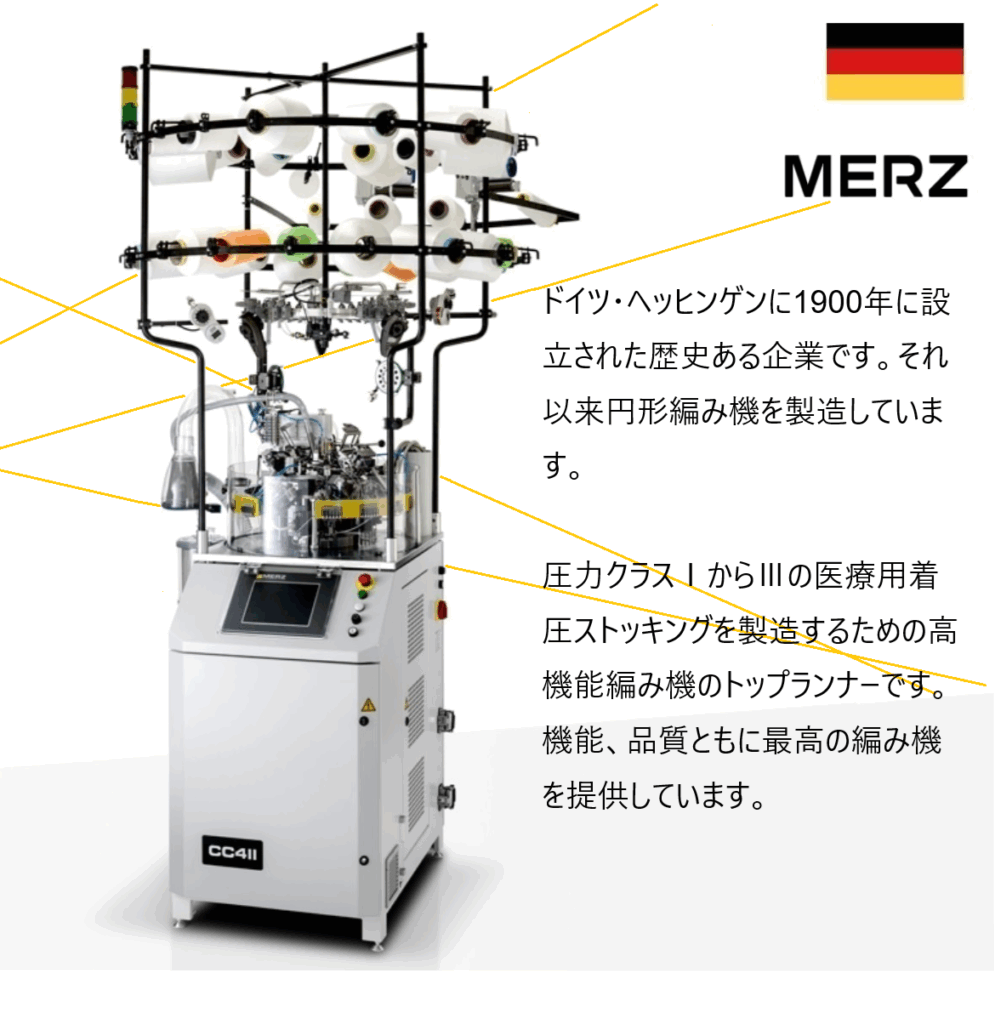 イタリア製靴下編み機とドイツ製着圧ストッキング編み機の2トップ